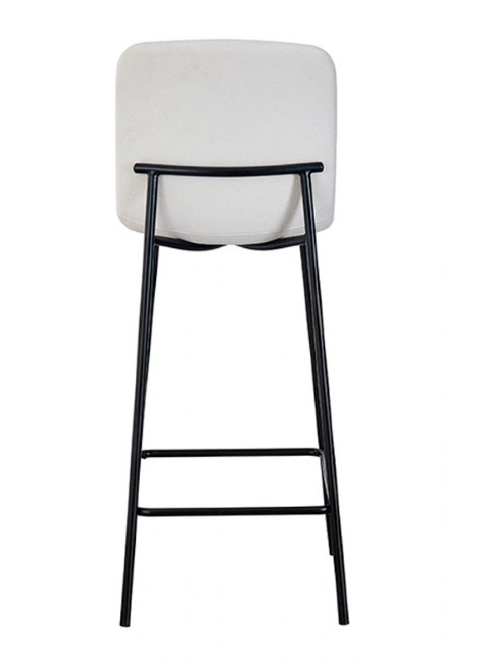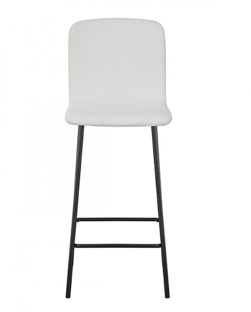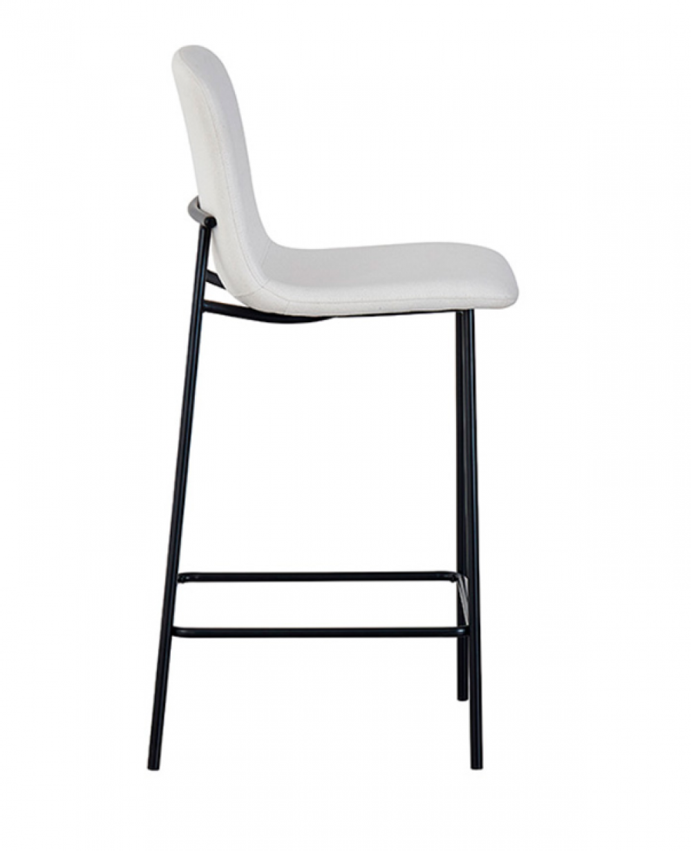 Banqueta estofada em tecido e base em aço pintada à pó.