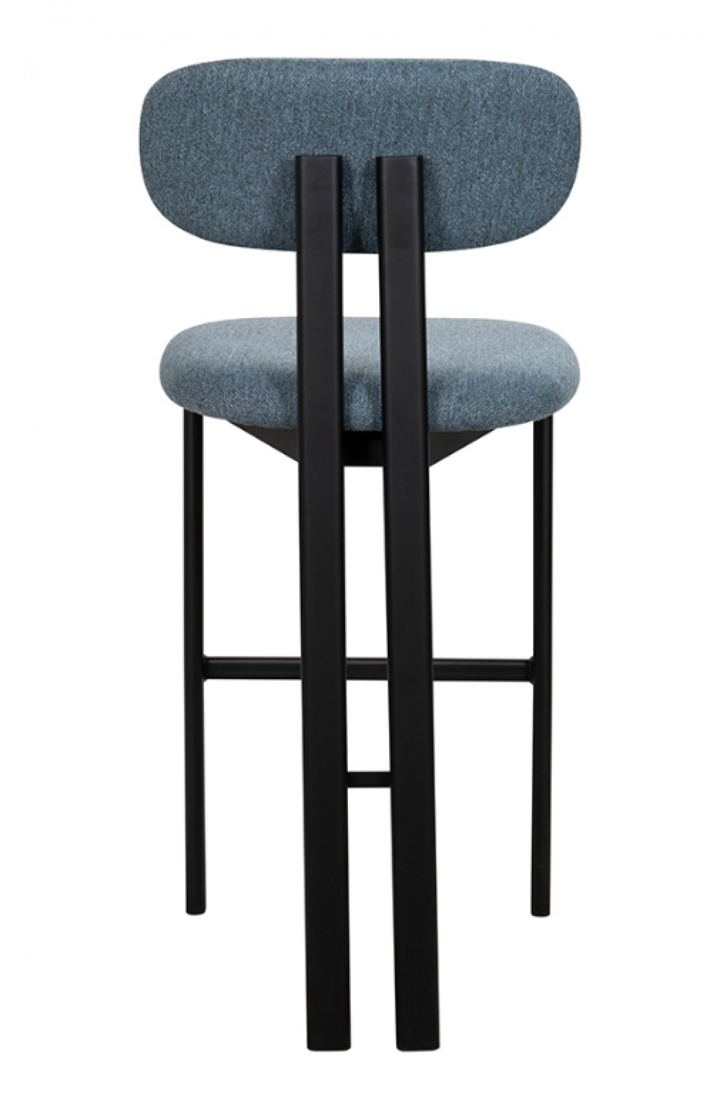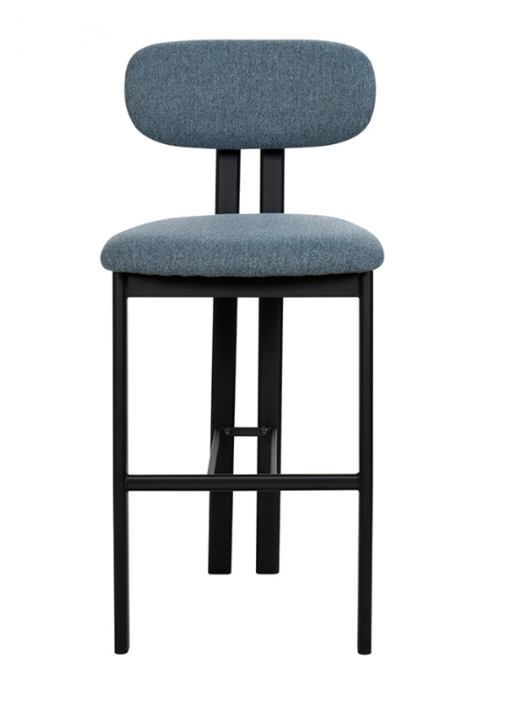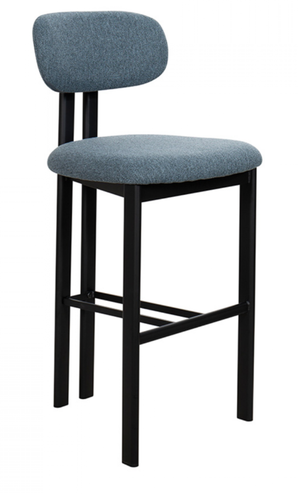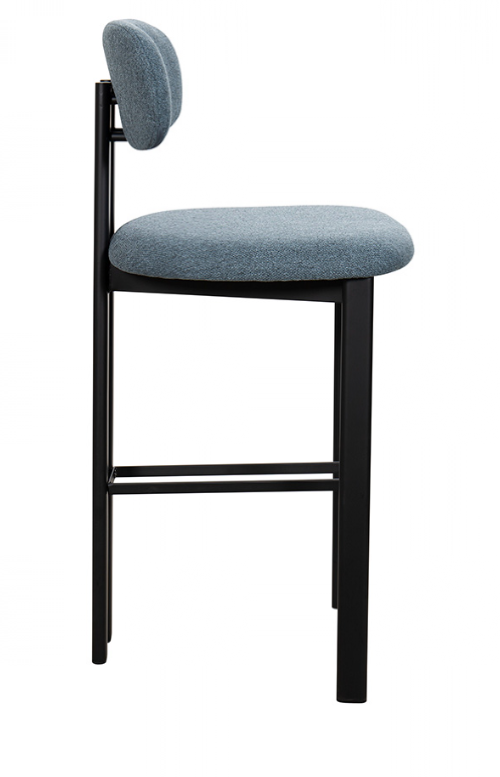 Banqueta estofada em tecido poliéster sustentável e repelente à água. Base em aço pintada à pó.