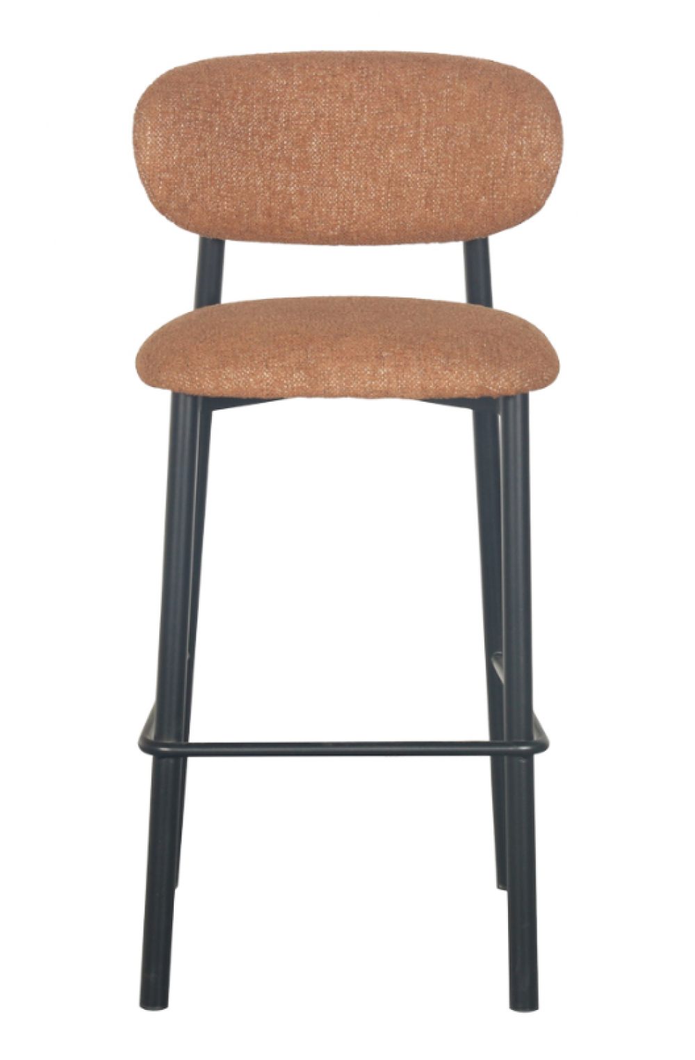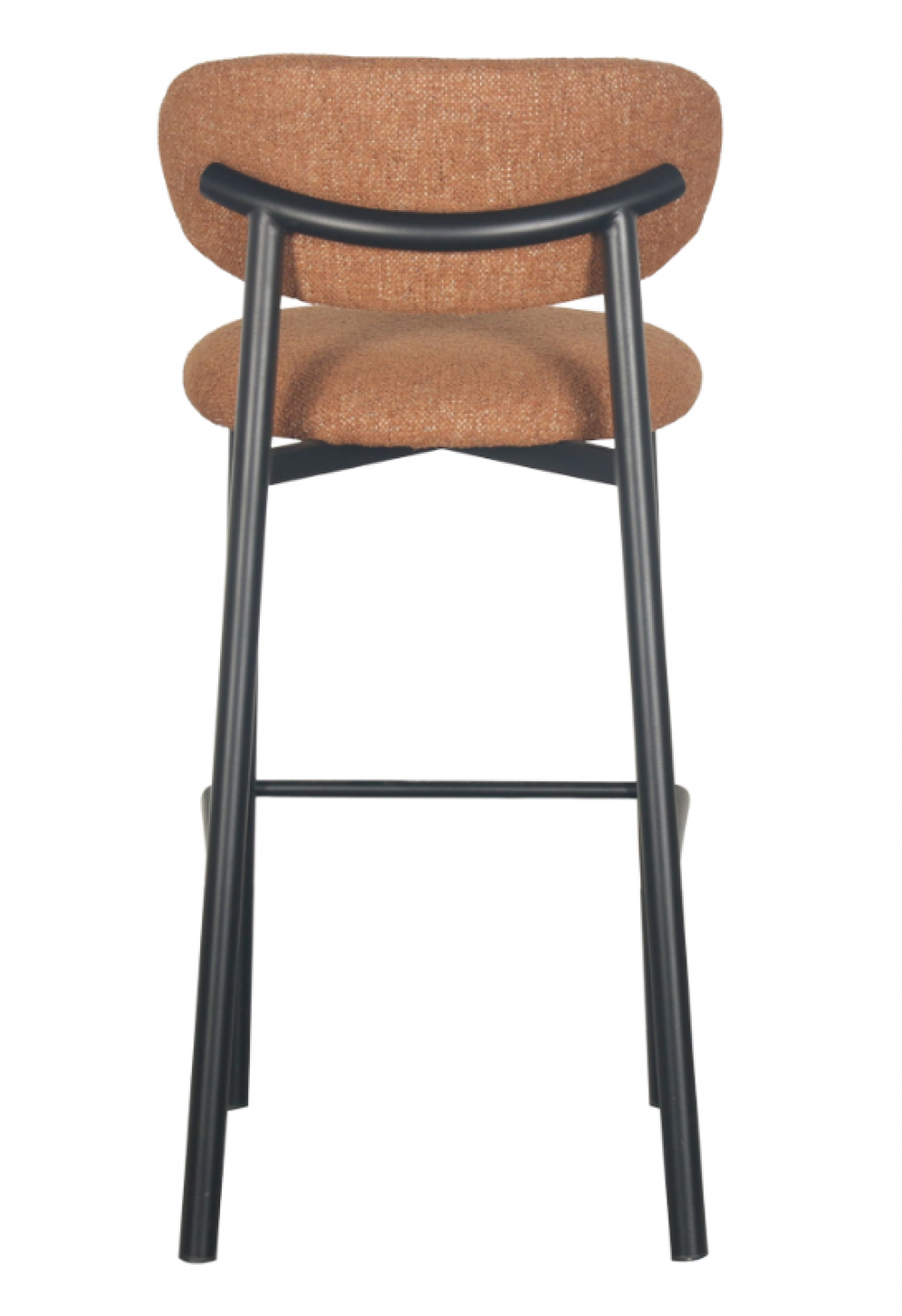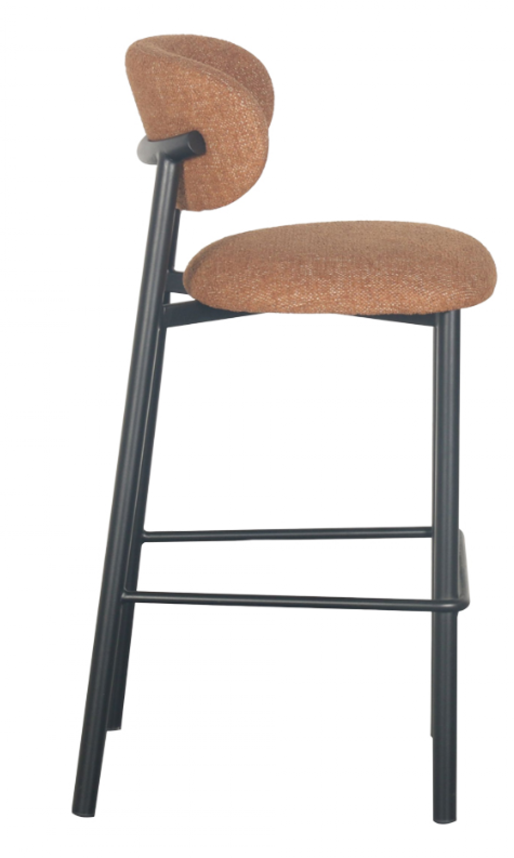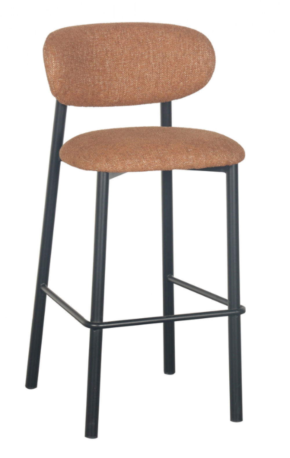 Banqueta estofada em tecido com base em aço pintado à pó.