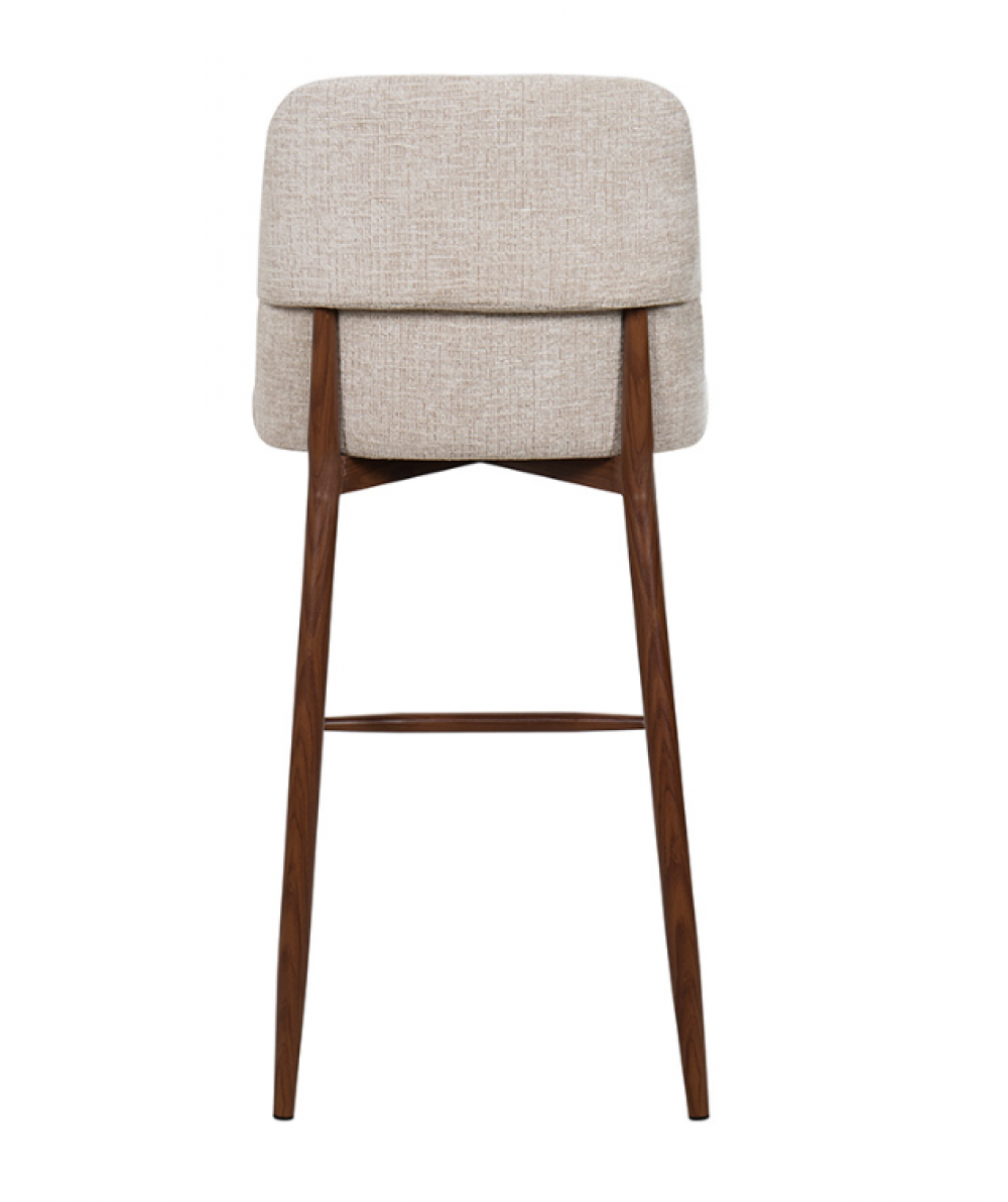 Banqueta estofada em tecido e base em aço com aplicação de adesivo por transferência de calor.