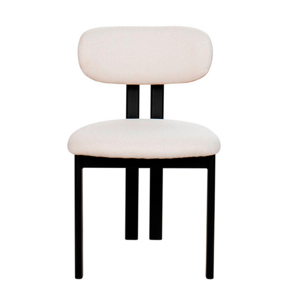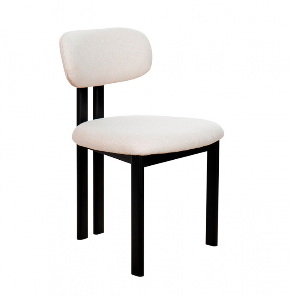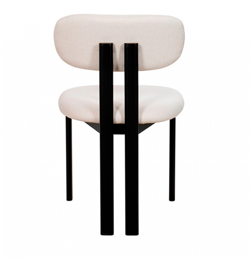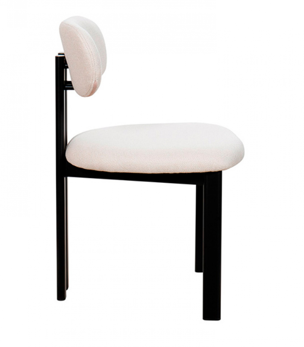 Cadeira estofada em tecido poliéster sustentável e repelente à água. Base em aço pintada à pó.