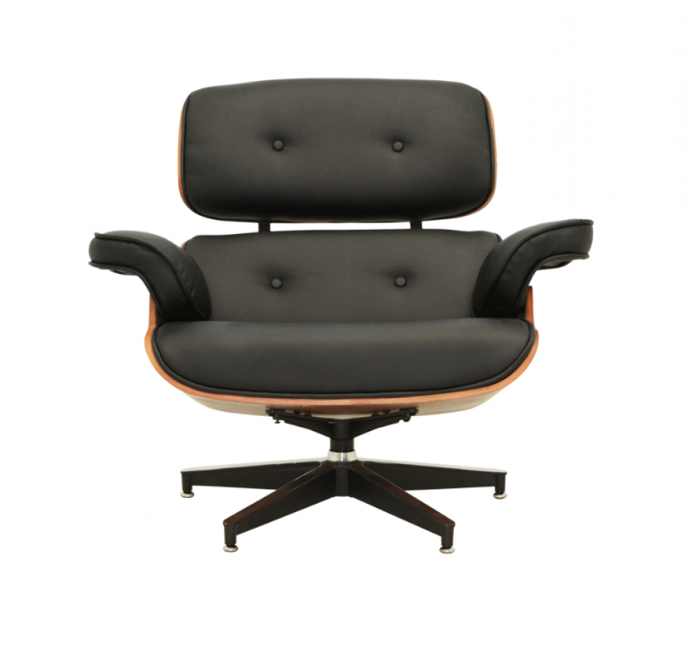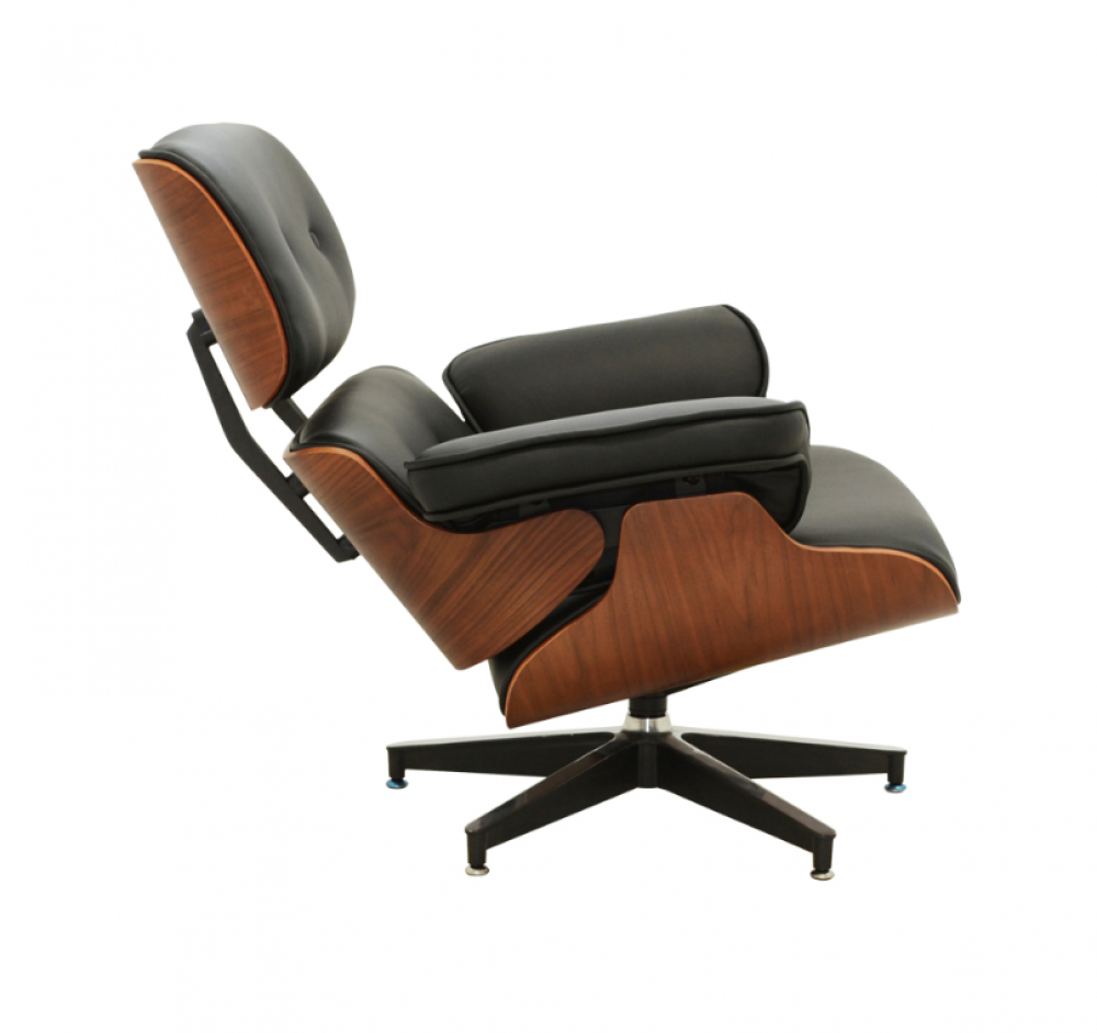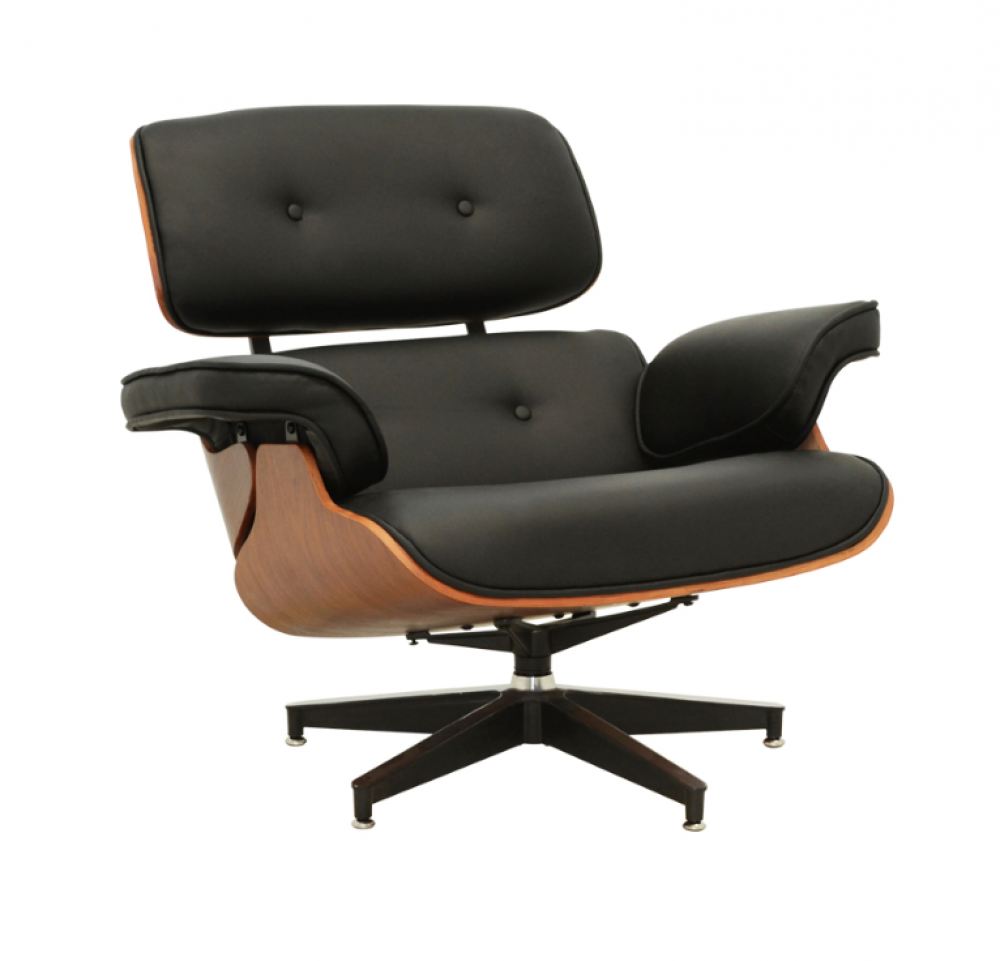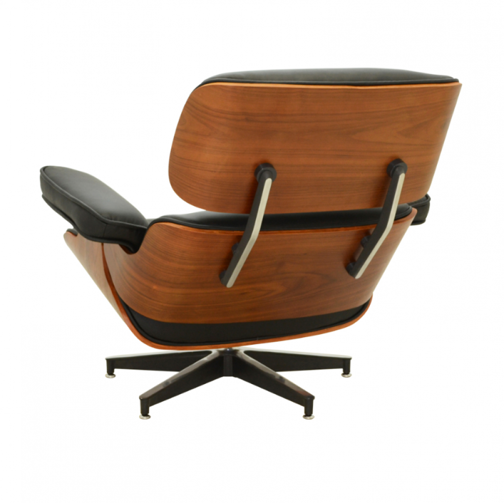 Poltrona giratória em madeira nogueira, estofada e revestida em PU. Base em alumínio pintado.
