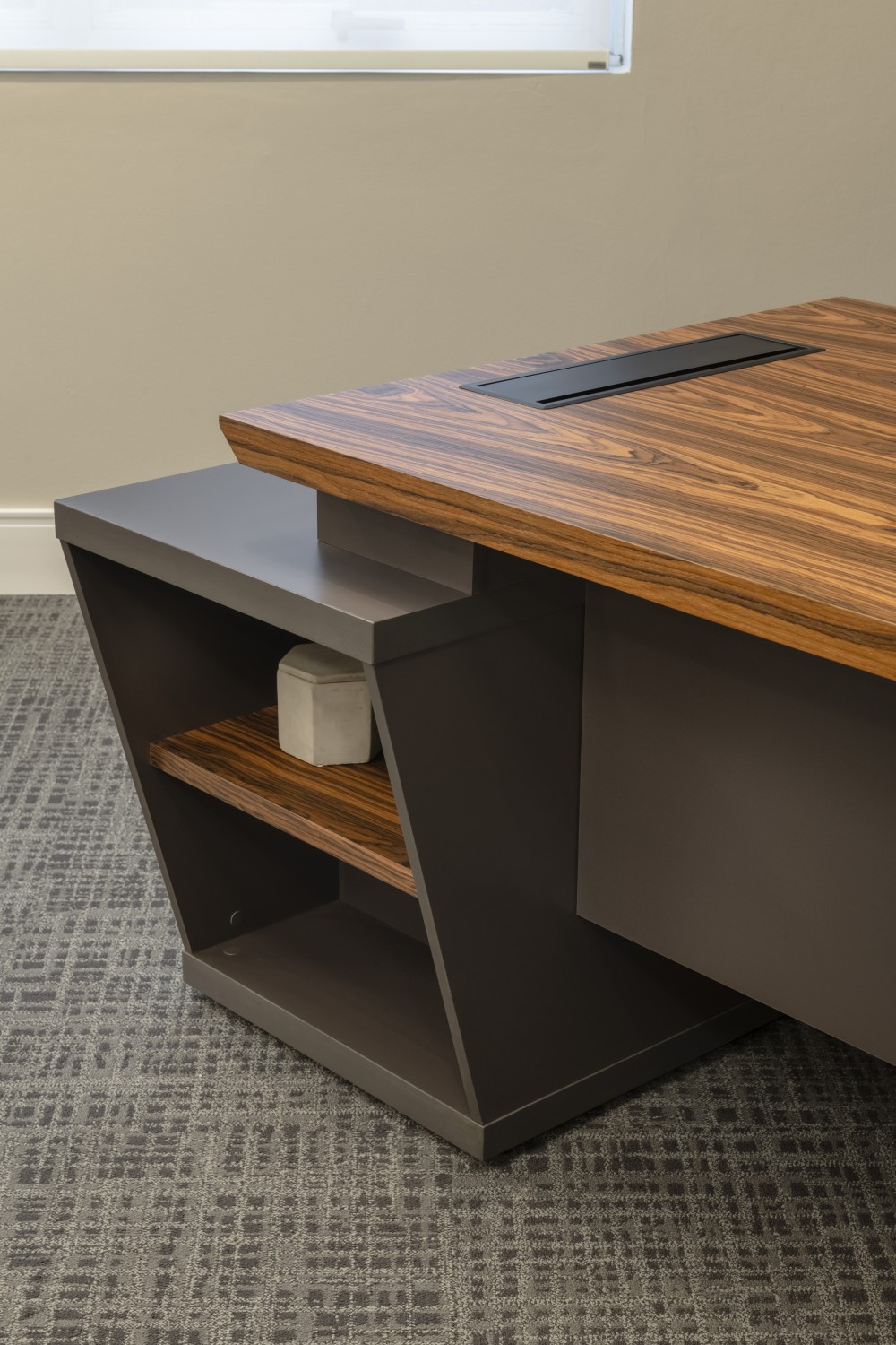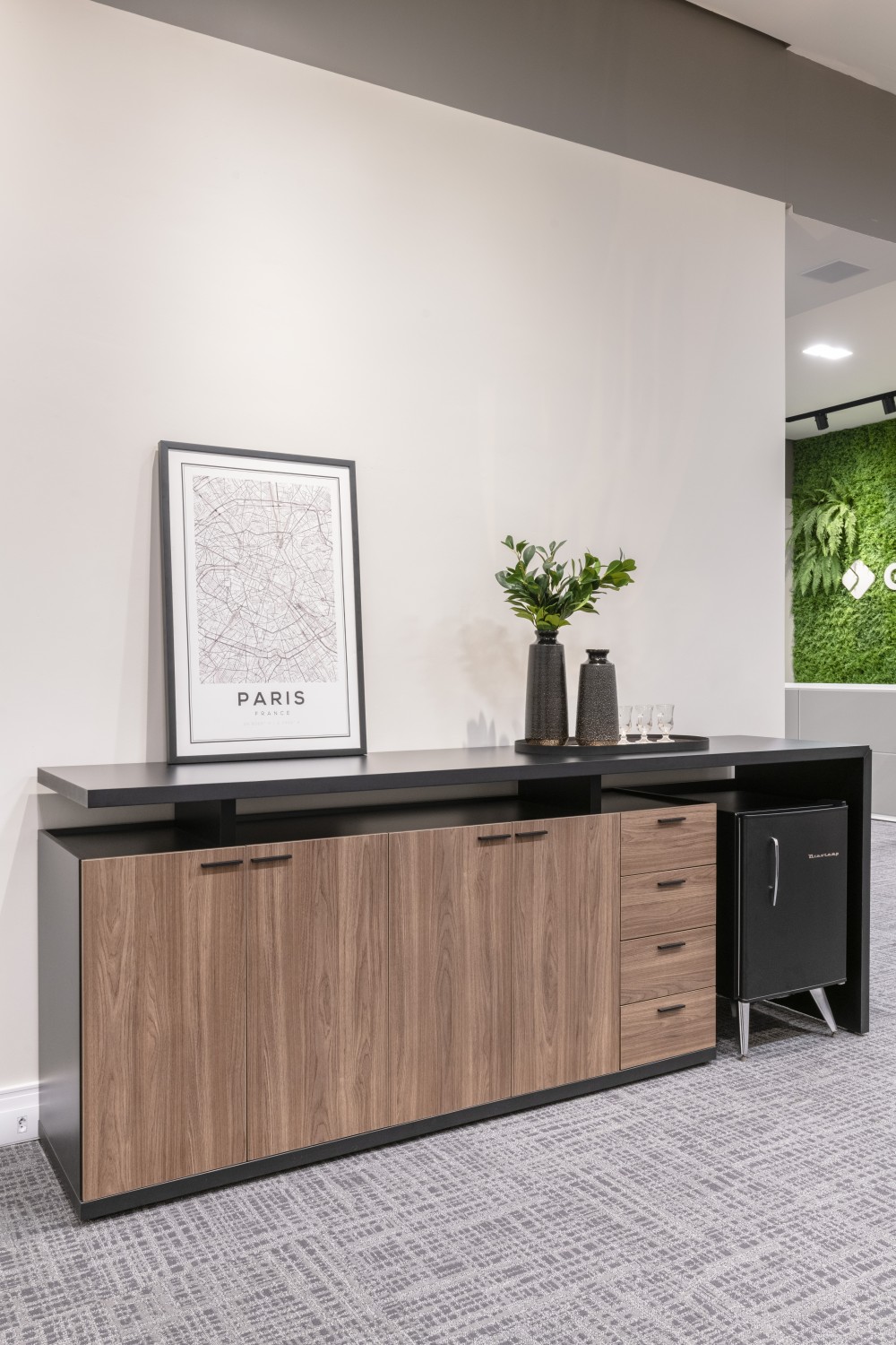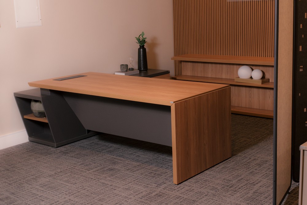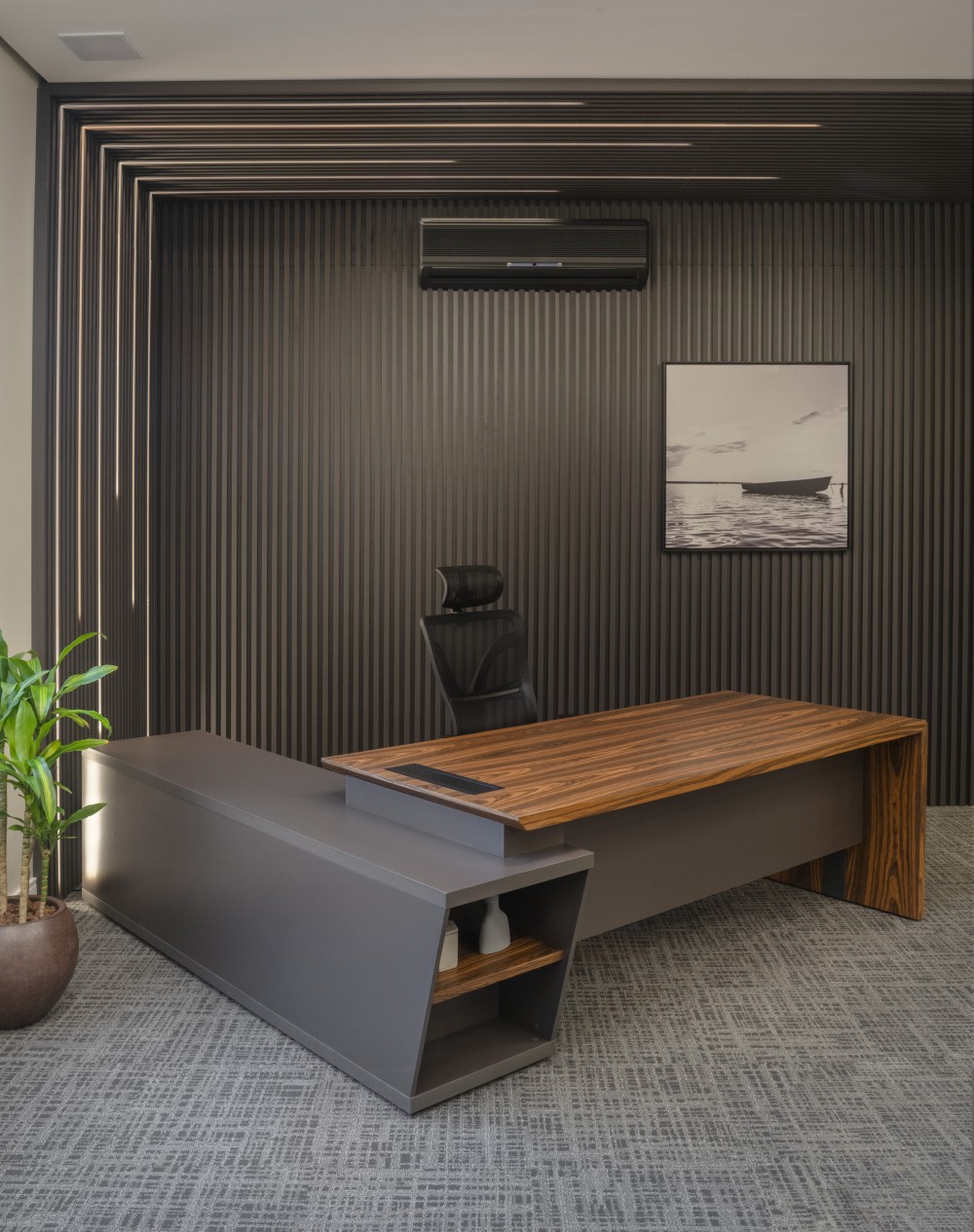 Combinando design, qualidade e robustez, a linha Dom apresenta soluções para escritórios diretivos e ambientes de reunião. Com tampos de 40mm com acabamentos de 45 graus e opções de cores requintadas, essa linha é perfeita para áreas gerenciais e de diretoria.