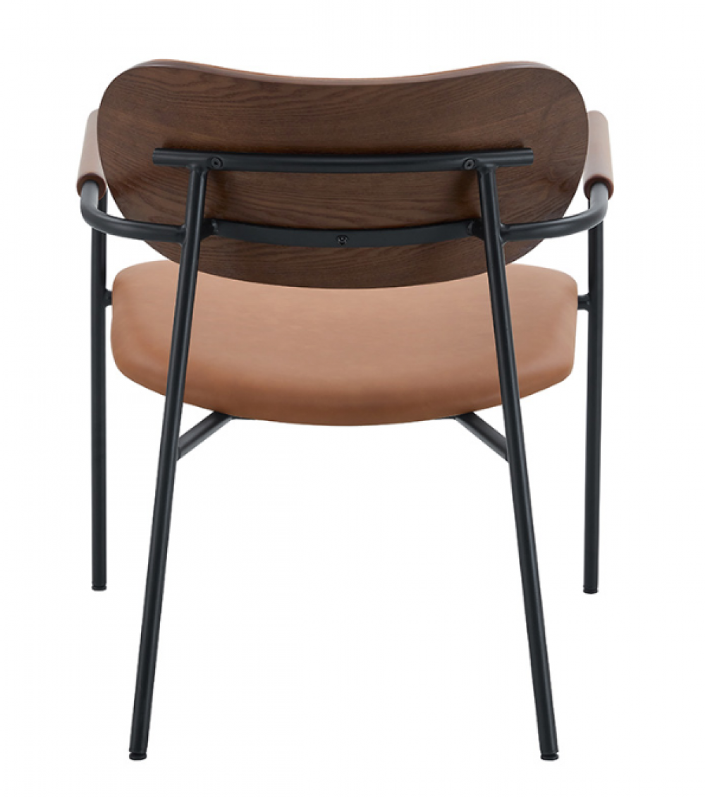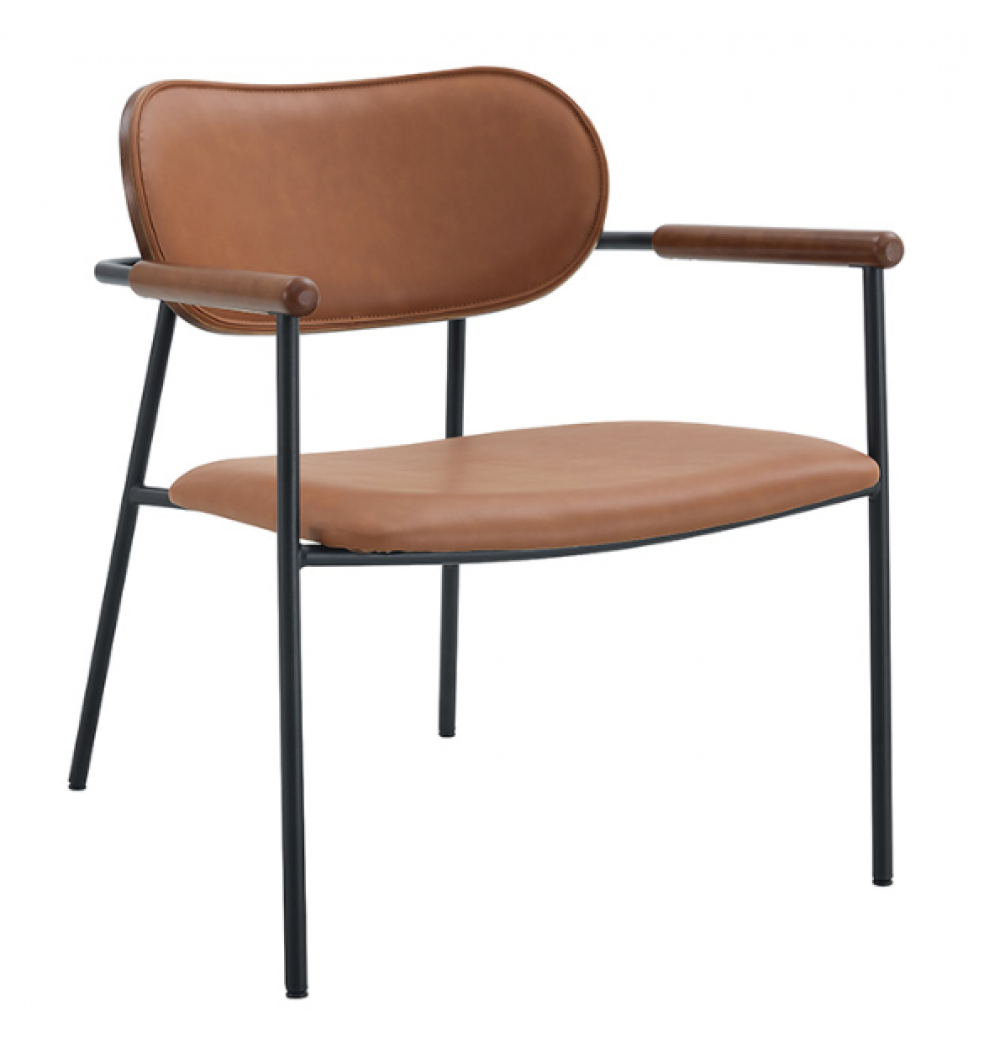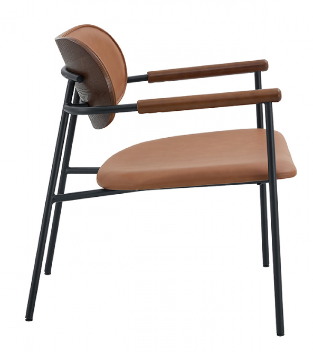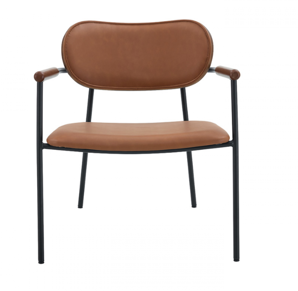 Poltrona estofada em poliuretano ou em tecido com base em aço pintada à po. Encosto em madeira de freixo e braço em madeira de faia.